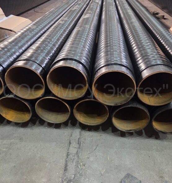 Труба электросварная Э/С D20-426 ГОСТ 10704/10705/10706/20295/8732 ст3/ст20/ст09г2с/ст17г1с-у наружным ленточным полимерно-битумным покрытием ТУ 24.20.13-003-64166666-2016 усиленного типа, Конструкция №6 ГОСТ 9.602-2016 (УС6) на основе полимерно-битумных лент в 1 сл. и обертки “Полилен” в 1(2) сл., толщина покрытия 2,4..3,2 мм (весьма усиленного типа ВУС6 по ГОСТ 9.602-2005), предназначена для подземной прокладки с температурой эксплуатации транспортируемой жидкости до +40°C.